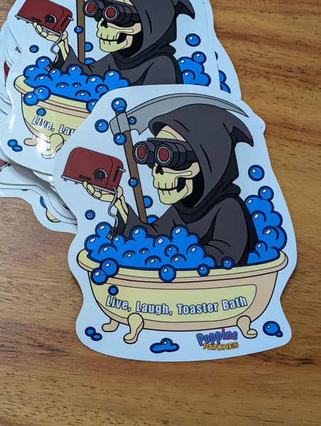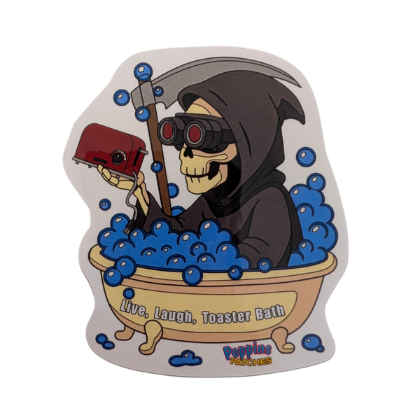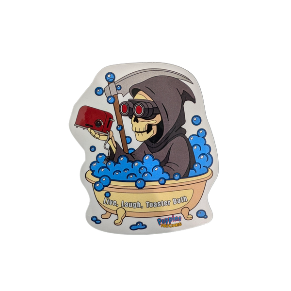 3in height x 2.5in width sticker depicting a reaper incorrectly observing proper safety practices with electrical appliances around water.